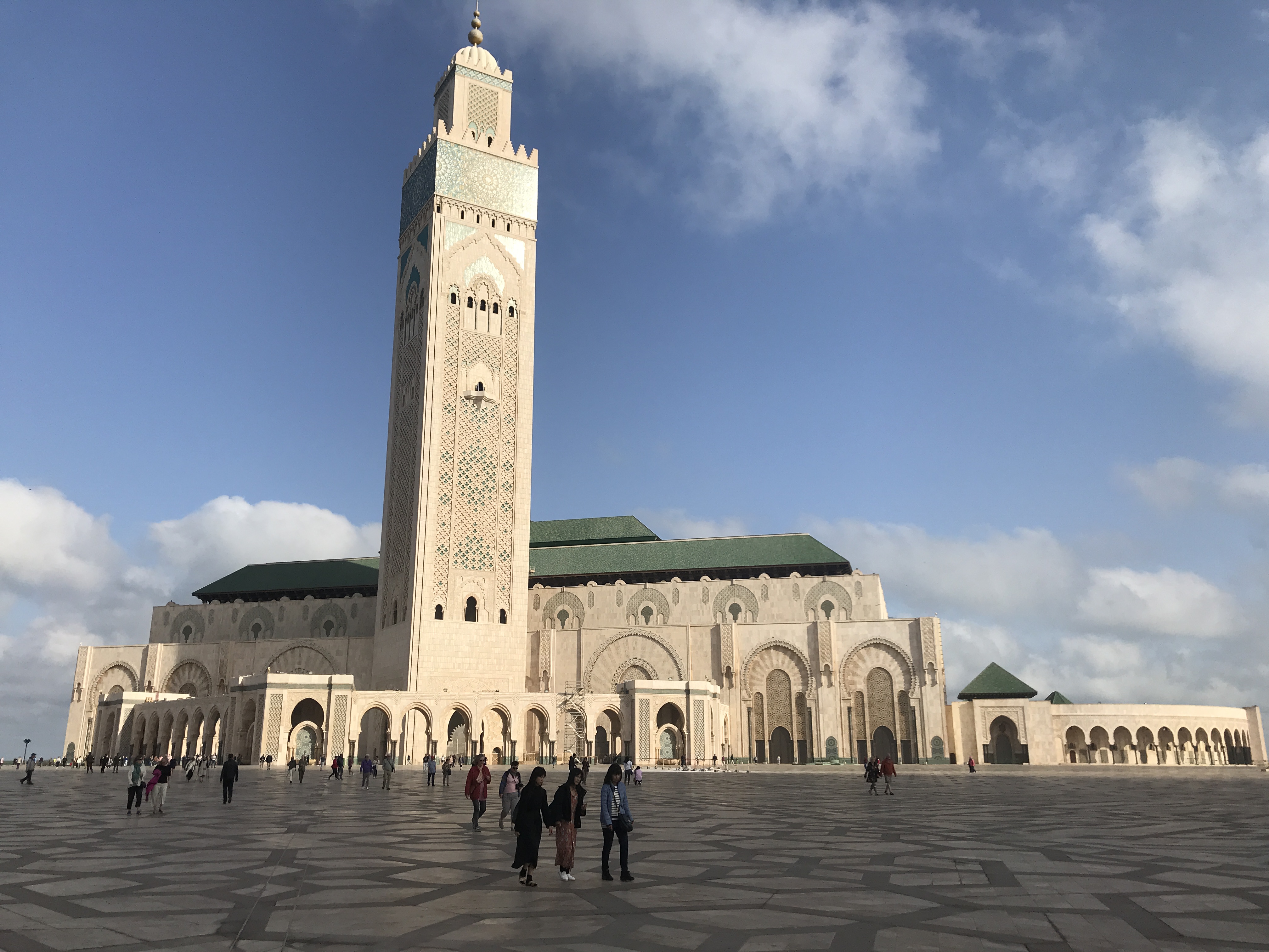 The next day we visited the Hassan II Mosque. This is one of the few mosques in the country where non-Muslims are allowed to enter. They offered tours in various languages and we joined the English tour. The mosque is situated on the coast of Casablanca and has a 690-foot minaret, the tallest in the world. The exterior and interior of the building were impressive. It was designed by a Frenchman, who wasn’t a Muslim. Most of the materials used in the construction came from Morocco. The doors are made of a mixture of brass and titanium (to protect against the corrosion of the salt air). The ceiling, made of intricately carved cedar, can be opened during times of worship. The massive building took 7 years to build, they had over 2000 workers and craftsmen working 3 shifts, 7 days a week.