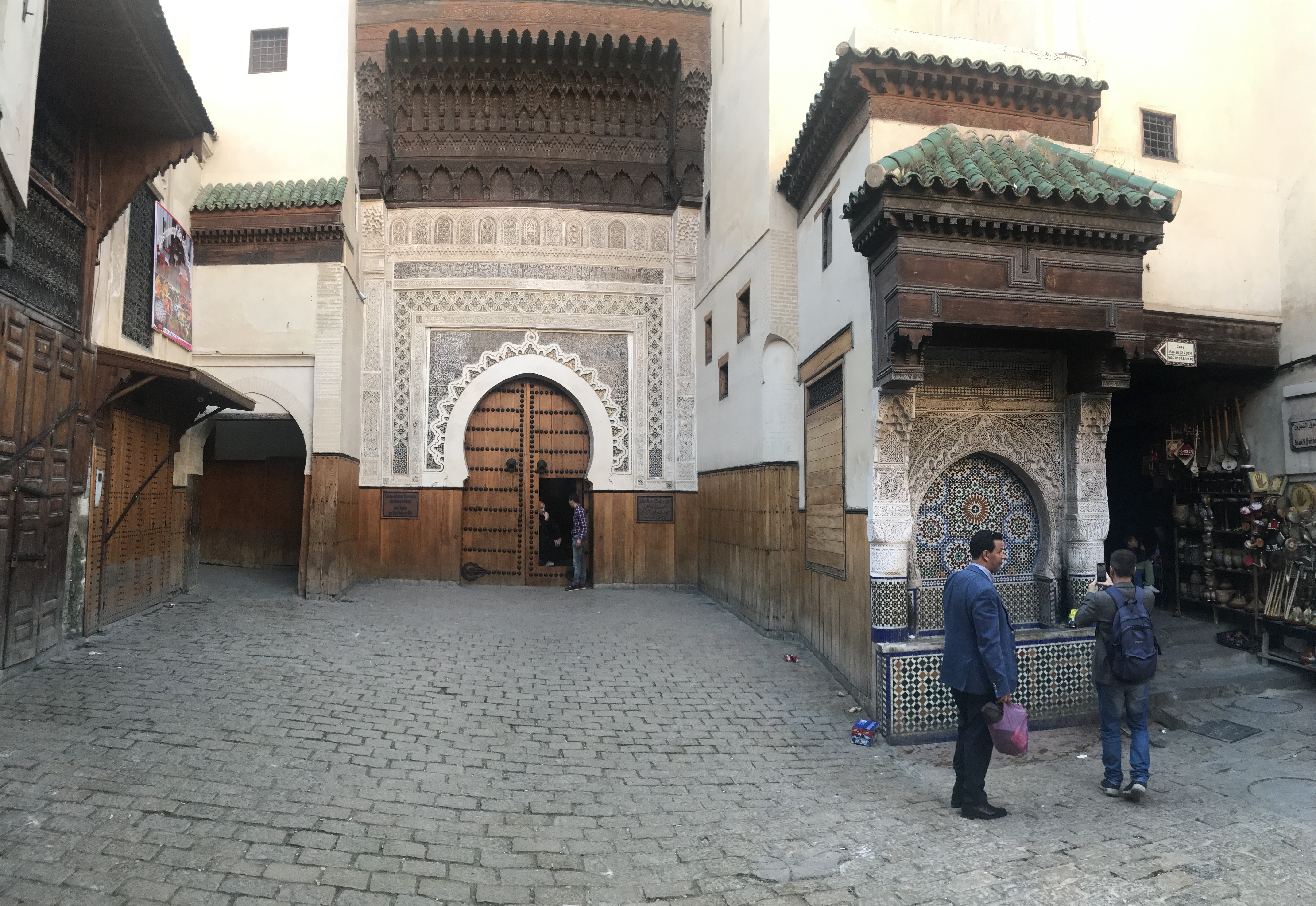 We made two stops at leather tanneries. Fez is a major trade center for leatherwork and for raw leather. Beware! Visiting a tannery is a smelly occasion. The process uses lime and pigeon poop to cure the leather. Visitors are offered twigs of mint leaves to hide the smell. On the second day, we visited the Jewish Quarter. What distinguishes this area are the balconies made of wood and ironwork.