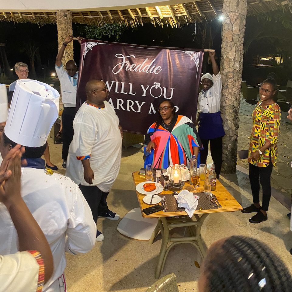 As the woman was taking in the dancing and celebrating, unbeknownst to her, two other staff members brought out a huge banner and unrolled it behind her. It read, “Freddie, Will You Marry Me?” The singers pointed behind her. She turned around and read the surprise message. It was a very exciting event to have witnessed.