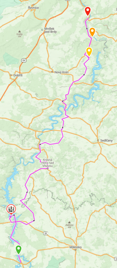 Today was mostly a riding day, although we didn’t start off on our bikes. We began the day’s travels on a boat. We boarded at Zvikov Castle perched at the southern end of the reservoir, meaning that after the other passengers casually made their way down the 20 or so steps to the pier, I first schlepped my bike, then Kathrin’s, down the staircase, then handed them to a couple of boat hands who set them on the deck. We then chose a table offering a prime view of the lake shore and, 50 minutes and a rain shower later we disembarked at Orlik Castle, Zvikov Castle’s, bigger sister, overlooking the northern end. We had a look around, found the geocache here, then mounted our bikes.
