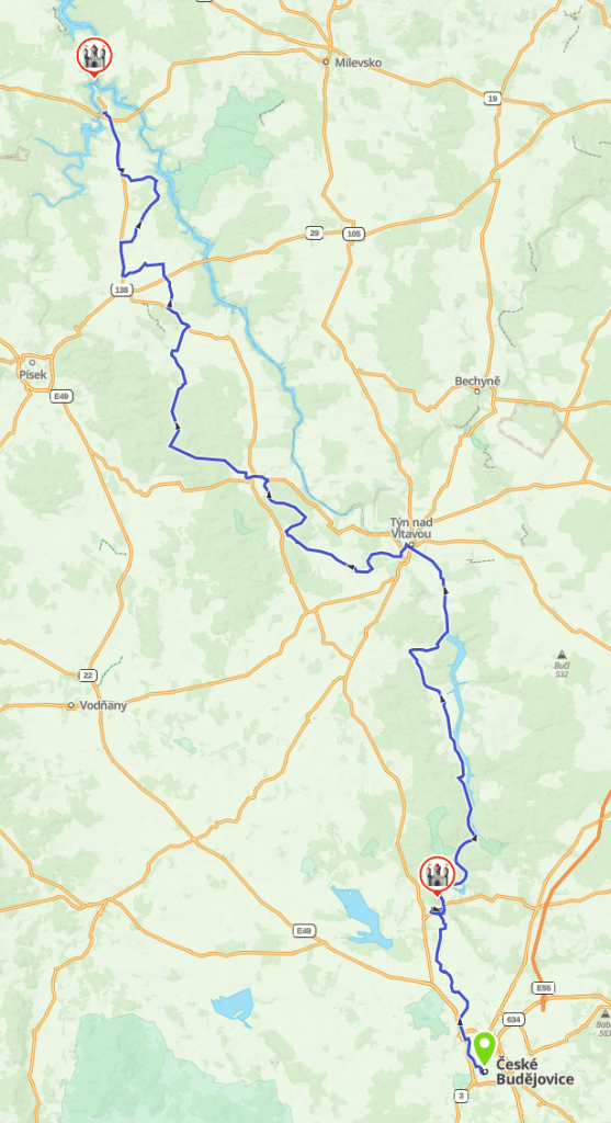 Our longest day, from Zvikov to Davle, was 90 grueling kilometers (56 miles for you Americans.) We didn’t plan it that way, we wanted to stop sooner, but a lack of accommodation forced us to keep going. Our shortest day, Davle to Prague, was 30 kilometers (19 miles), also not planned, it was the other side of the coin from the extension the day before. The most strenuous day was our first day, from Bayerisch Eisenstein to Bucina, the route had over 1,650 meters of elevation change, 1051m up and 605m down. We put our batteries to the test that day!