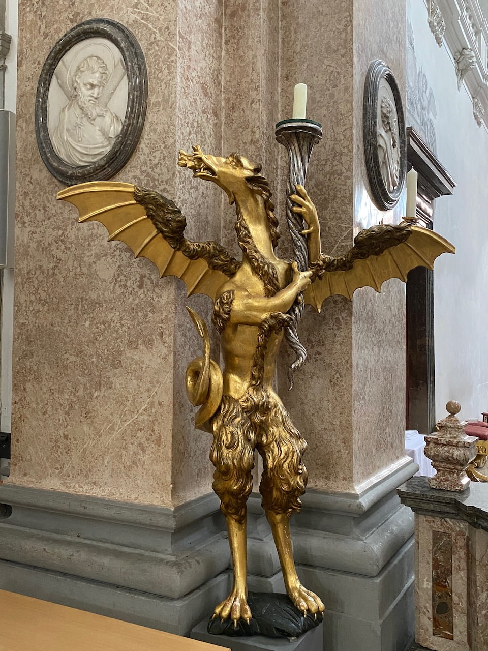 We also visited St. Mang’s Basilica and monastery, founded in the 9th century by an Irish monk and hermit, who built a cell and oratory here, then over time it was expanded to its current size. The building suffered considerable damage in the 30 Year’s War and was rebuilt in its current form in the late 18th century in the Baroque style. The interior is nothing like Wieskirche’s over-the-top Rococo style. It was more austere and brighter, using a lot of polished marble. What caught our eye was the odd dragon-like candle holders on each side of the alter.