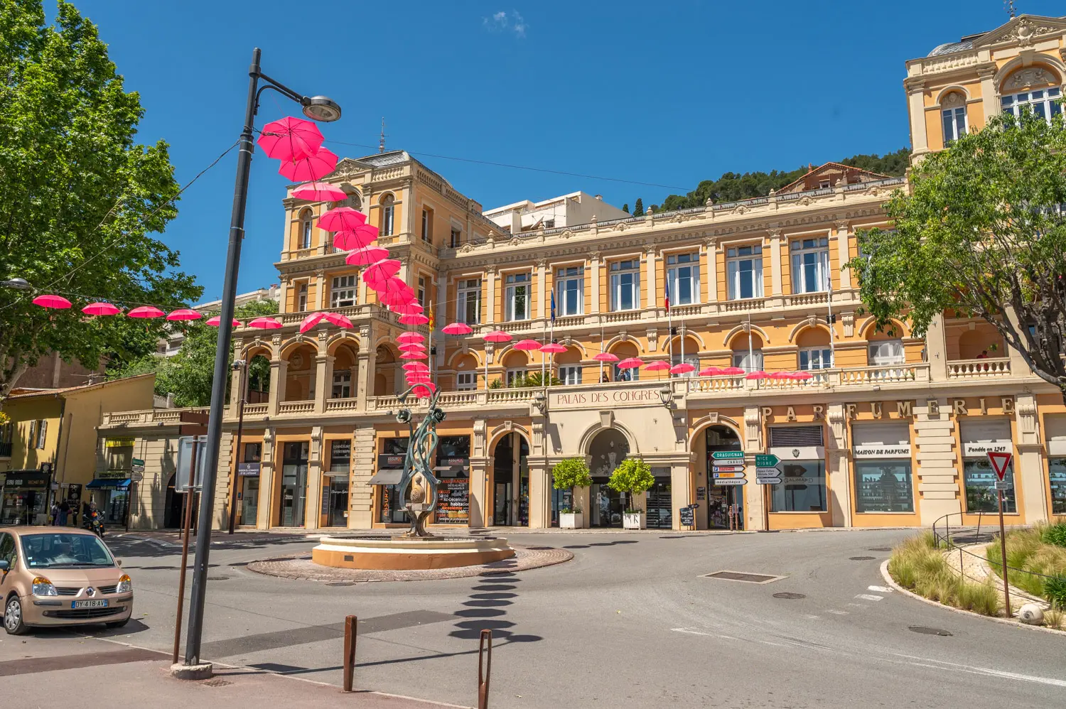 By 11:30, we arrived in Claviers and quickly spotted an appealing restaurant for lunch. Of course, when you’re hungry, every restaurant looks appealing! Unfortunately, it wasn’t open yet, so we decided to ride a bit further. The path was challenging, especially for Kathrin, with its gravelly surface, tight turns winding down through steep terrain. By noon, we reached Callas, a larger town with a bustling atmosphere. We found another inviting restaurant near a lively farmers’ market. As this day was another one where a single battery charge was tight, we were glad that the restaurant staff kindly allowed us to charge while we enjoyed a delicious French chicken dish and dessert. Afterward, I left a generous tip to show our appreciation.