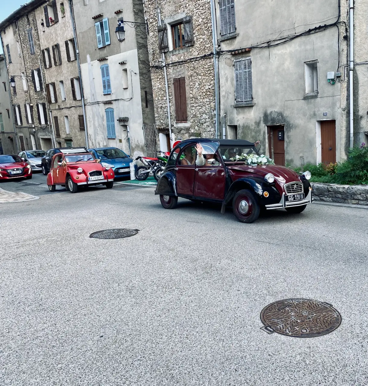 The route led us through Draguignan, where a lively carnival was underway, and Fayosc, another charming town. We circled around the church, and just as we were leaving, a wedding car caravan passed by. Leading the way were two motorcycles, followed by the newlyweds in a classic Citroën 2CV, known as the Ente (Duck.) After the motorcade had gone, we continued on, only to cross paths with them again in a different part of town.